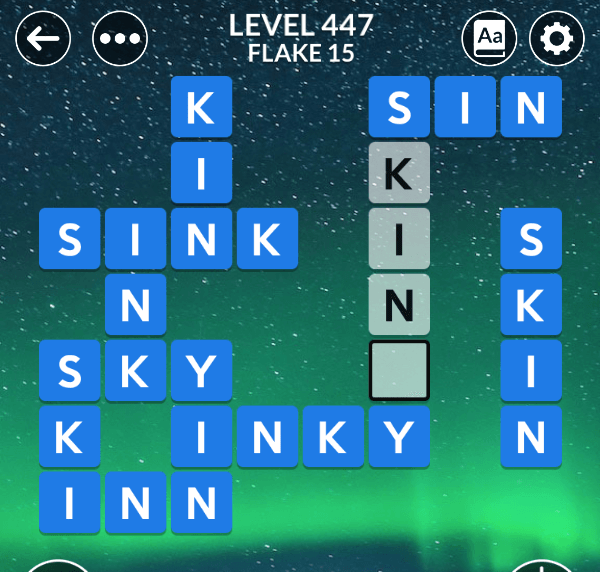 The Wordscapes level 447 is a part of the set Winter and comes in position 15 of Flake pack. Players who will solve it will recieve 38 brilliance additional points which help you imporve your rankings in leaderboard.